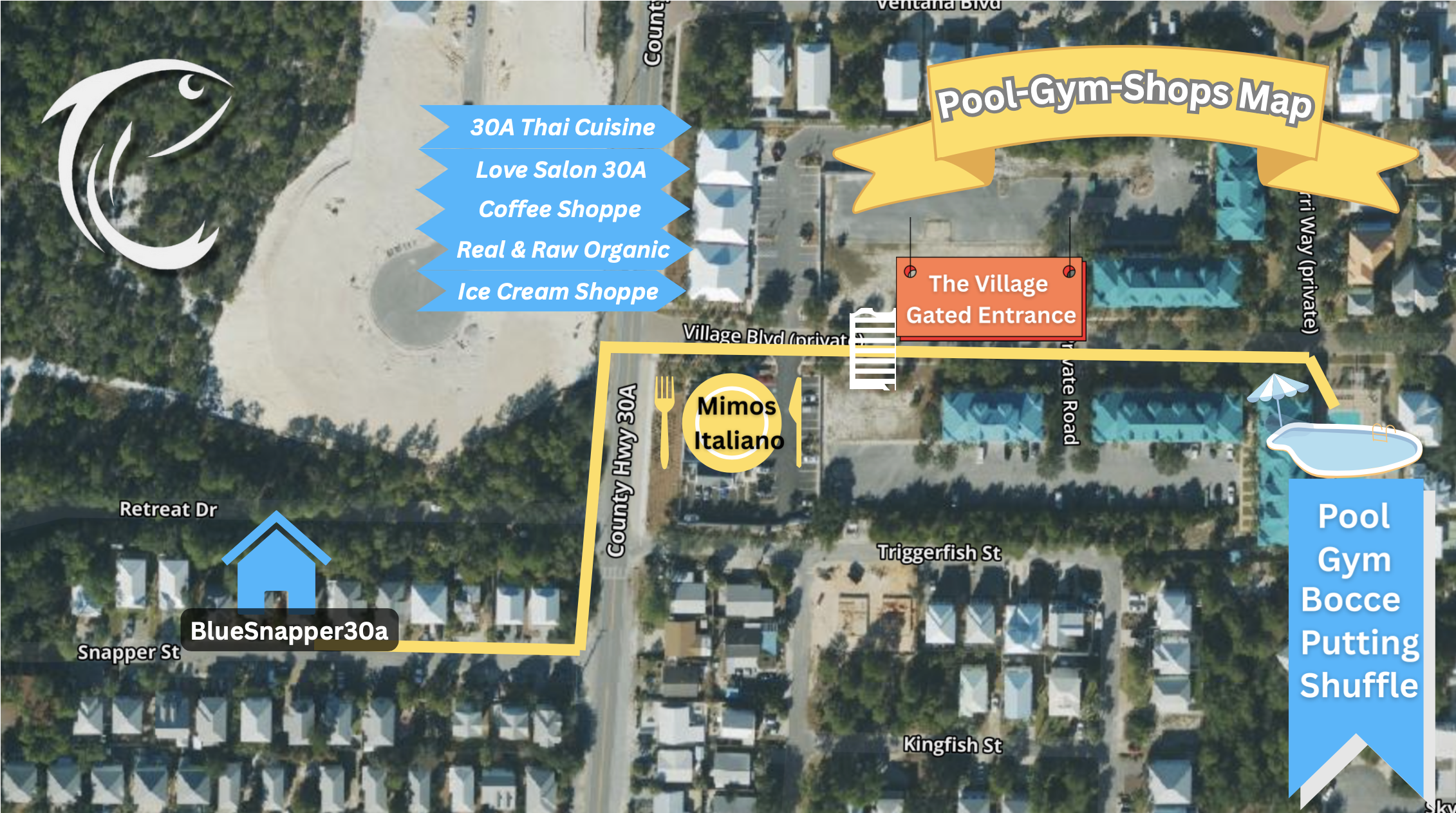 Located south of Scenic Highway 30-A in Blue Mountain Beach, tucked into a quiet little neighborhood, Blue Snapper is a short golf cart ride or walk to the sugar white sand beach. Blue Mountain Beach is home to emerald water, coastal dune lakes, excellent restaurants, large Publix grocery store with retail shopping nearby, bay & gulf fishing nearby, and gorgeous sunsets.